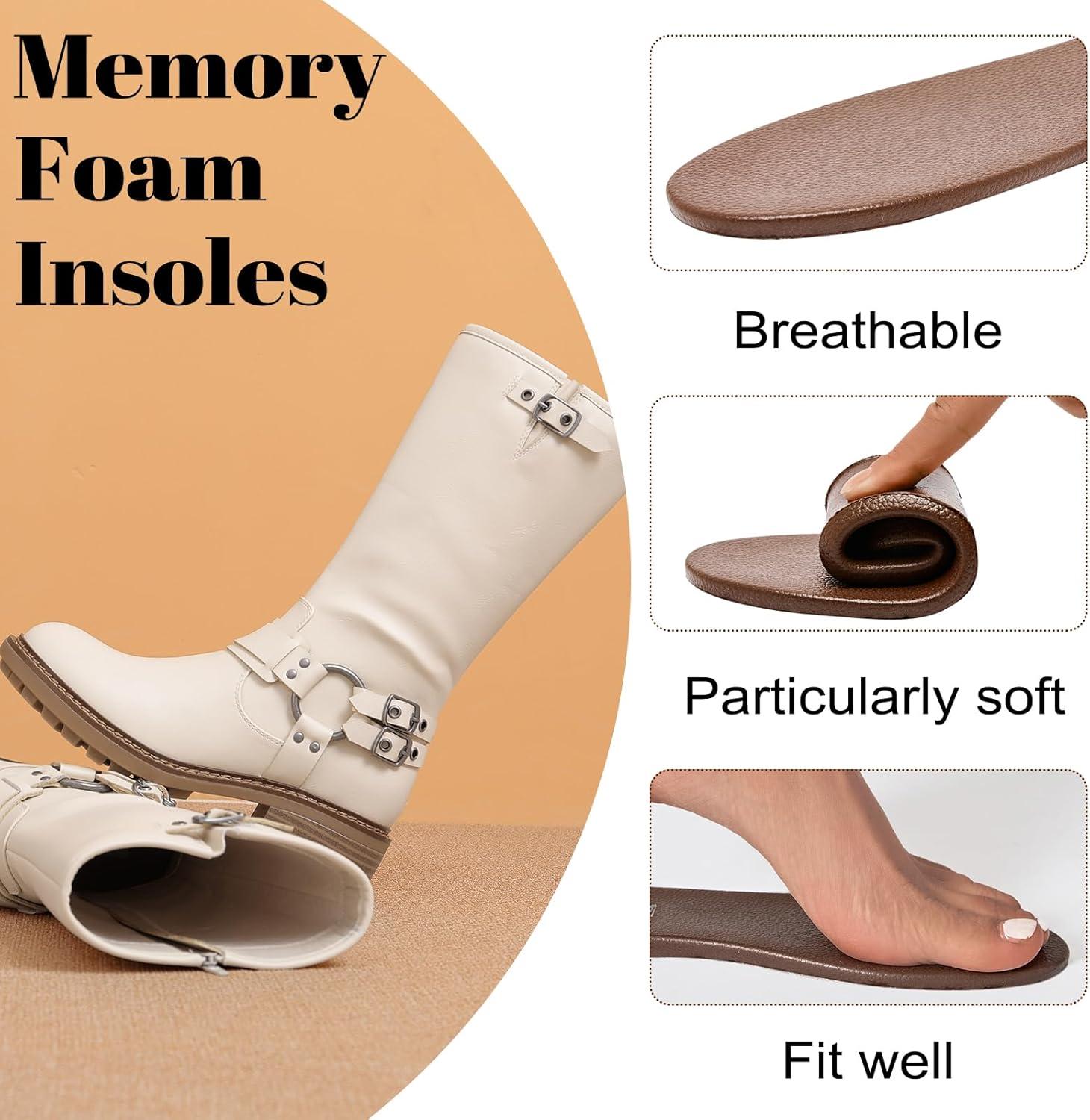 Mid Calf Boots for Women Flat Casual Round Toe Fashion Calf High Boot Buckle Dressy Fall and Winter Low Heeled Womens Boots.(White Mf 973)