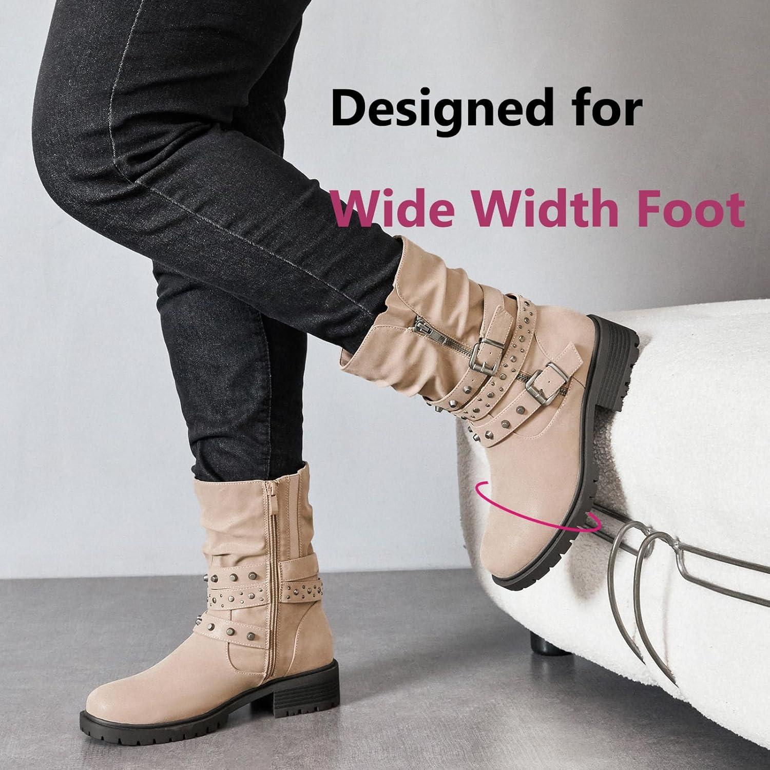 Women’s Wide Width Ankle Boots True Plus Size Wide Foot Flat Slouchy Booties Comfort Riding Combat Rivet Short Boots for Women.(Taupe Pu 372)